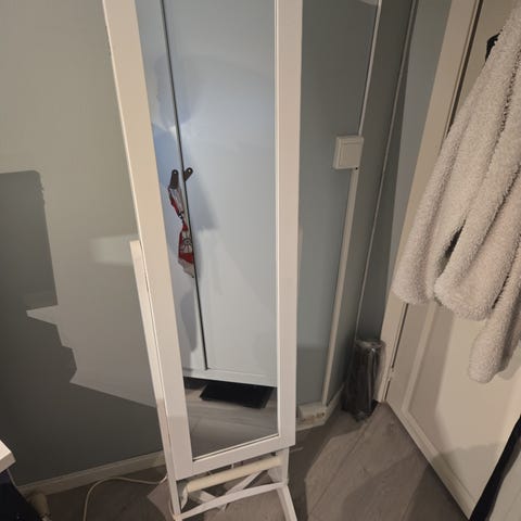 IKEA smykkeskap med speil i hvit utførelse. Skapet har helfigurspeil på utsiden av døren og flere oppbevaringsløsninger på innsiden, som kroker til smykker, stenger til armbånd og ringer samt hyller og rom for annen småoppbevaring. Egnet til organisering og oppbevaring av smykker og tilbehør i soverom eller garderobe.