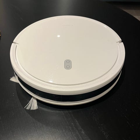 Robotstøvsuger i hvit farge. Enheten leveres med ladestasjon og strømadapter, slik bildet viser. Egnet for automatisk støvsuging av gulv i hjemmet og mopp.