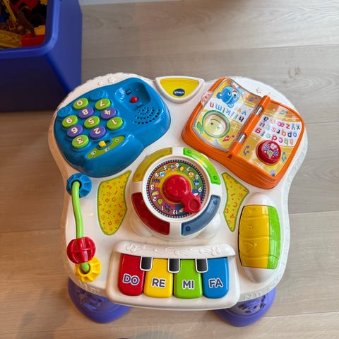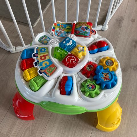 Fargerikt aktivitetsbord for små barn. Ballene kan kastes i trakter på toppen og ruller gjennom ulike baner og skjulte veier før de kommer ut nederst. Gir mye mestring og underholdning.