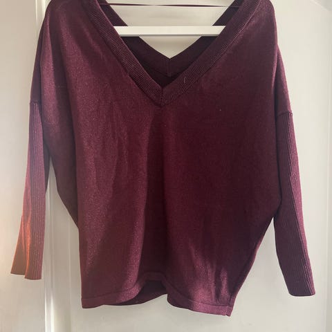 Riccovero genser for dame i størrelse S. Genseren er rød og har V-hals. Materialet er hovedsakelig akryl med innslag av merinoull, noe som gir et mykt og lett plagg. Ermene og bolen har ribbestrikket struktur. Passer til hverdagsbruk og kan kombineres med både bukser og skjørt.