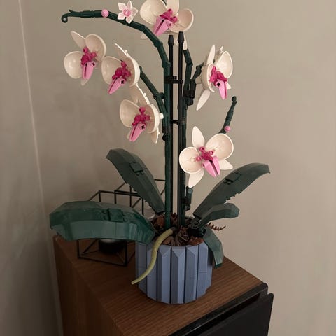 LEGO Botanical Collection orkidé byggesett. Modellen forestiller en orkidé i potte bygget av LEGO-klosser, med hvite og rosa blomster og grønne blader. Settet er egnet som dekorasjon og som byggeprosjekt for LEGO-interesserte ungdom og voksne. Kan plasseres på bord, hylle eller vinduskarm som en vedlikeholdsfri plante laget av LEGO.