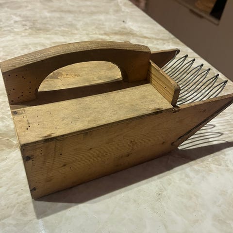 Bærplukker håndmodell i rød plast med sort håndtak. Plukkeren har metalltenner i front for effektiv innsamling av bær fra busker og lyng. Utformet som en lukket beholder som samler bærene under bruk. Egnet til manuell plukking av for eksempel blåbær, tyttebær eller lignende i skog og mark.