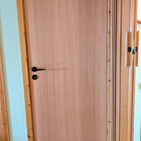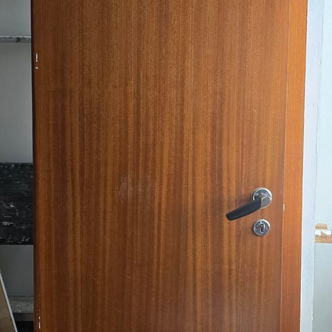 Innerrdør i trefiner med karm. 90 x 210. Høyrehengslet. Komplett med låskasse og håndtak.