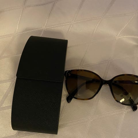 Prada solbriller for dame med rektangulær ramme. Innfatning i brun mønstret (tortoise) plast og mørke glass. Bredere stenger med Prada-logo på siden. Egnet som hverdagssolbriller og til bruk i sterkt lys. Litt striper på glasset, men det kan byttes.