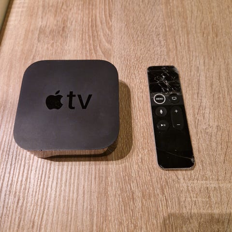 Apple TV 4K 1. generasjon med fjernkontroll og strømkabel