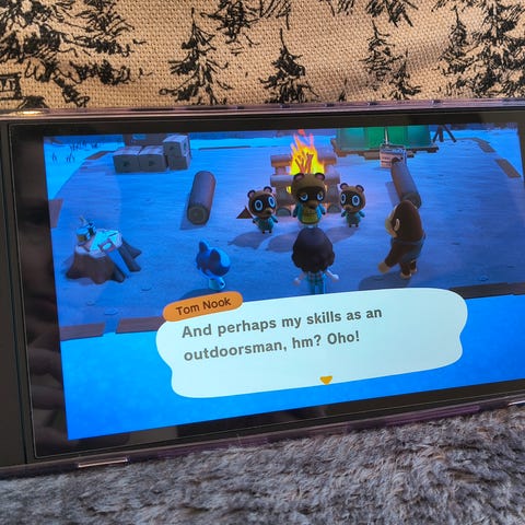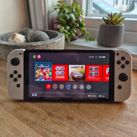 Nintendo Switch konsoll. Konsollen kobles til TV eller kan brukes håndholdt. Bildene viser blant annet spillet The Legend of Zelda på skjermen og spillet «Snufkin: Melody of Moominvalley» i fysisk utgave til Nintendo Switch. Egnet for én eller flere spillere avhengig av spilltittel og kontrolleroppsett.
