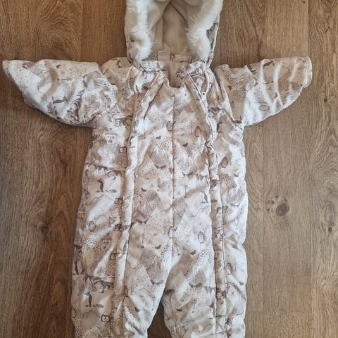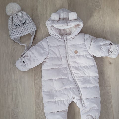 Selger to flotte vinterdresser i størrelse 68, samt luer og tøfler. En veldig tjukk vinterdress og en litt tynnere.
