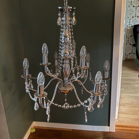 Selger vakker lysekrone. Massivt smijern i mørkebrun/kobber med glassdetaljer. Nydelig over spise- eller sofabord, i hall. På fjellet eller hjemme. Selges billig pga en defekt pæresokkel.