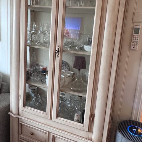Svak fargeforskjell på toppen grunnet en duk som har ligget på. Mangler knotter/håndtak til to av dørene. Fulgte ikke med når jeg kjøpte den og jeg kom ikke så langt at jeg ordnet med nye.