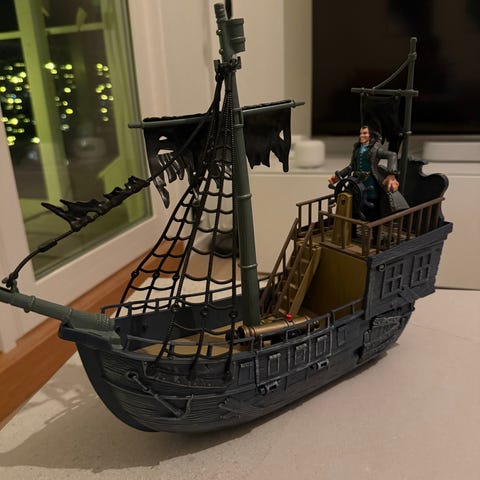 Kaptein Sabeltann - Grevinnen Spøkelsesskute. Plastskip med detaljer som fangehull (med åpning på siden av skipet), kanon (med kule), seil, rekkverk, ror og mast, samt medfølgende piratfigur Greven av Gral.