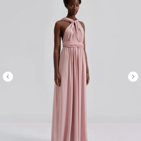 ASOS kjole i sateng for dame i størrelse XS. Kjolen er lang med halterneck-utringning og drapert brystparti. Fargen er rosa med lett glans i stoffet. Passer til bruk ved anledninger som bryllup, selskap eller andre formelle sammenkomster.