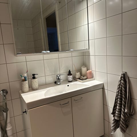 Baderomsinnredning med speil og flere høyskap. Kan selges del for del.