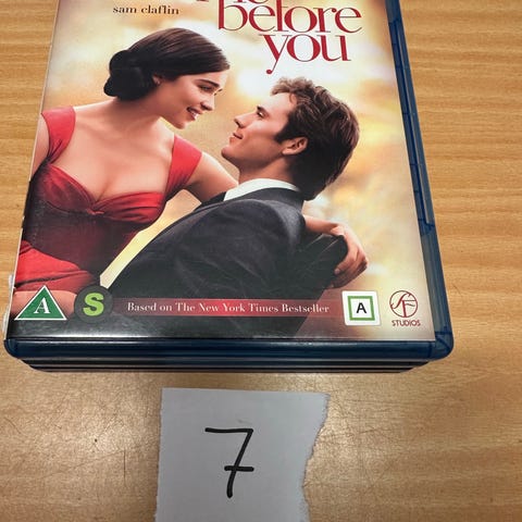 Blu-ray-utgave av spillefilmen «Me Before You». Omslaget viser aldersmerking A. Teksten på baksiden oppgir lyd- og tekstalternativer for flere språk. Egnet for avspilling på Blu-ray-spillere som støtter regionen angitt på omslaget.