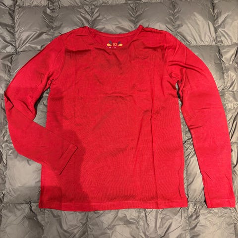 Rød/rosa genser med grafiske innslag av oransje.