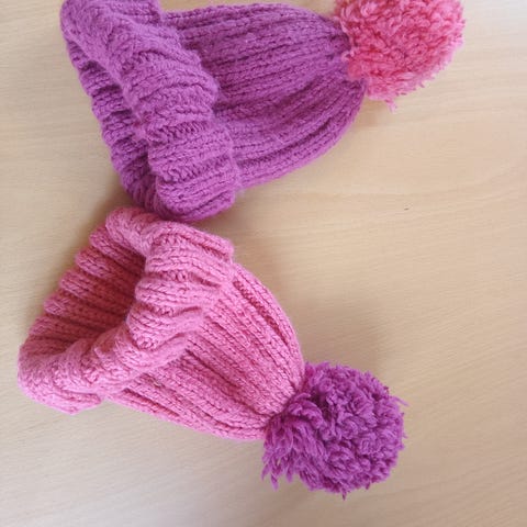 En lilla og en sterk rosa med katteører / refleksører. 100% merinoull og med vindstoppere i fleece. Tykk, myk og varm.
