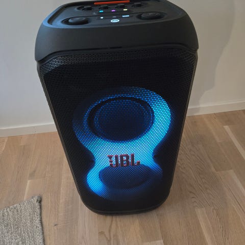 JBL PartyBox 100 trådløs høyttaler i svart. Bærbar Bluetooth-høyttaler med innebygde lysringer i front. Enheten har kontrollpanel på toppen/baksiden for volum, innganger og lysstyring. På baksiden finnes tilkoblinger for blant annet strøm, lydinn/ut og mikrofon/gitar (basert på modellens standardutstyr). Høyttaleren er egnet til bruk innendørs eller utendørs der det er behov for kraftig lyd og lys-effekter.