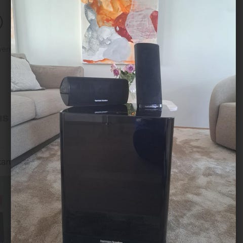 Harman Kardon høyttalersystem med tilhørende subwoofer.