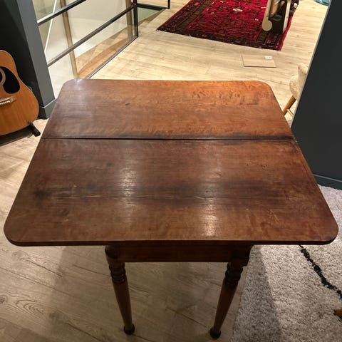 Lite sidebord i tre (mulig Mahogany)med rektangulær bordplate med avfasede hjørner. Bordet har en dreid søylefot som går over i en trefot med buede ben. Overflaten har synlig trestruktur og en mørk brun finish. Egner seg som lite avlastningsbord, lampebord eller plantestativ i stue, gang eller soverom.