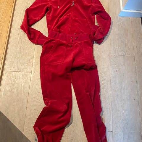 Juicy Couture heritage sett bestående av bukse og jakke. Buksen i størrelse XXS men noe stor i str så passer xs/s. Buksen er rød og laget i bomull. Modellen har utsvingte ben og lommer bak med klaff og knapp. Egnet som komfortabel hverdags- eller loungebukse. Jakke i L for en normal look. Veldig liten i str