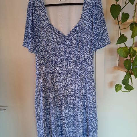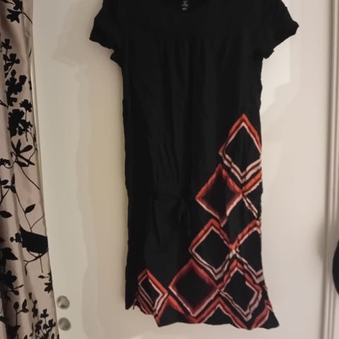 Dette er en kjole som kan brukes både til fest og til hverdag. Kjolen er mønstret med fargene svart, hvit, grått og veldig dus rosa. Den har ermer som rekker til ca litt over albuene og den rekker meg til ca litt over knærne, jeg er mellom 1.75 og 1.76høy.