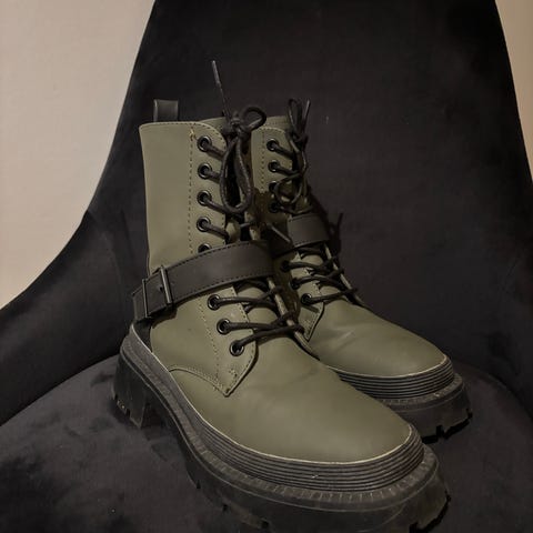 Ukjent merke snørestøvler i størrelse 40. Støvlene er i grønn farge med kraftig, profilert såle og metallhekter til skolissene. Modellen går over ankelen og har hempe bak for enklere av- og påtaking. Egner seg til hverdagsbruk og uteaktiviteter i kjøligere vær. Dame-/jente-modell basert på passform og stil.