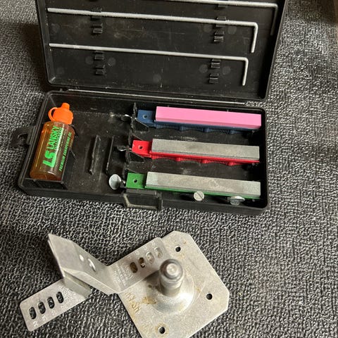 Lansky Sharpeners knivslipesett med flere bryner og slipeolje i plastkoffert. Settet inneholder slipebryner med ulike fargekodede holdere, styrestenger for å holde fast slippevinkelen, base/festeplate samt flaske med olje til sliping. Egnet for sliping og vedlikehold av ulike typer knivblader og lignende skjæreverktøy. Leveres samlet i et etui som holder delene organisert under bruk og oppbevaring.