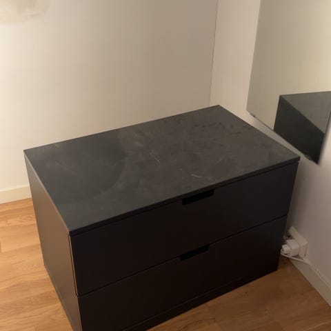 IKEA kommode med 4 skuffer i hvit utførelse. Kommoden har glatte fronter uten håndtak og rette, enkle linjer. Skuffene er romslige og egner seg til oppbevaring av klær, tekstiler eller annet utstyr på soverom, gang eller kontor. Overflaten er i hvit laminat eller tilsvarende plate materiale. Det er synlig en mindre skade på nederste skuffefront, som vist på bilde. Innvendig er skuffene i en mørkere grå tone. Kommoden står på lave føtter/sokkel og har flat topp som kan brukes til plassering av lamper eller dekor.