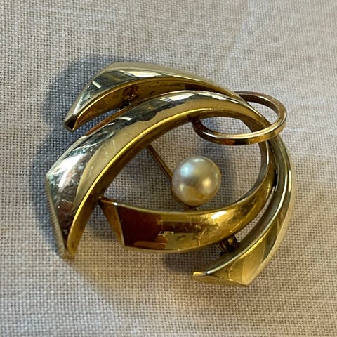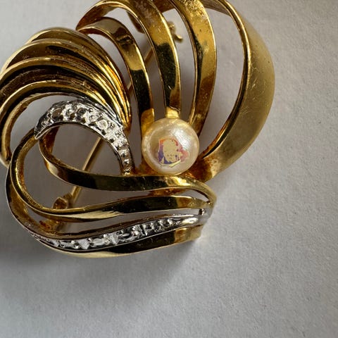 Vakker nål i gult og hvitt gull m ferskvannsperle.