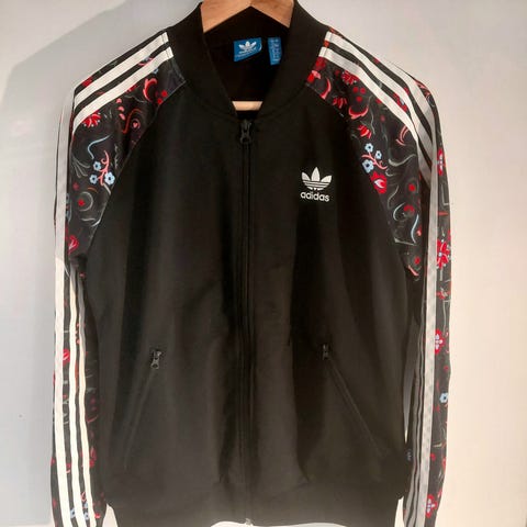 Adidas jakke for dame i størrelse M. Jakken er laget i polyester og har et flerfarget mønster med stripete/animalprint. Modellen har glidelås i front, ribbestrikket krage, mansjetter og nederkant, samt lommer i sidene med glidelås. Passer som en lett jakke til hverdagsbruk eller som et ekstra lag over treningstøy.
