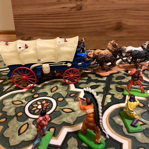 Timpo Toys cowboy lekefigur med kalv og bål plast
