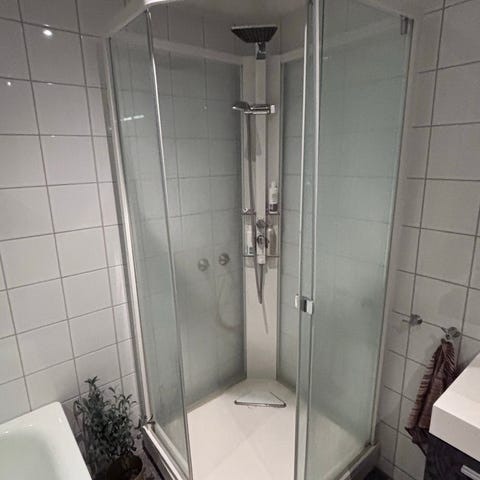 Godt brukt. Blir dessverre ikke vasket før salg. Mål på dusjvegger er bredde: 90cm x 90cm (buet), høyde 190cm.