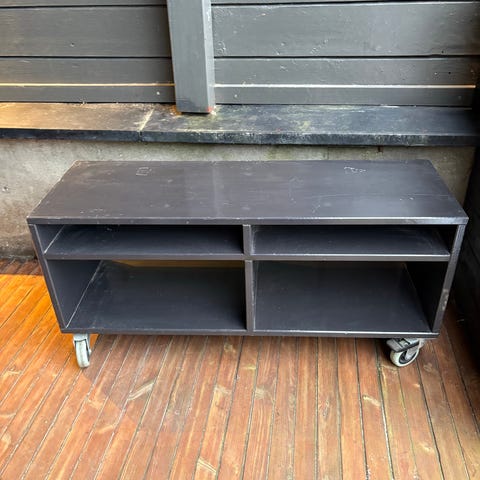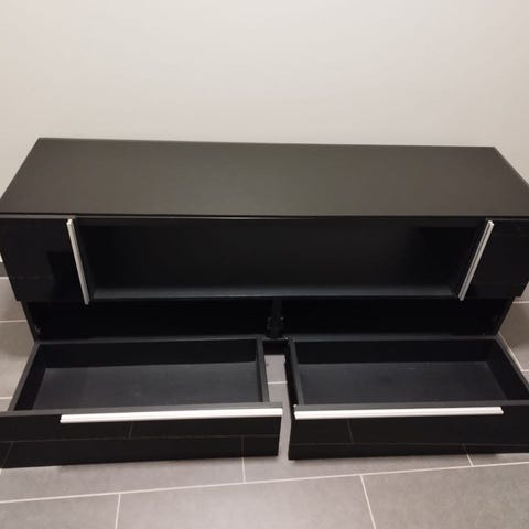 Den grå benken har buet front med glassdører og åpne hyller til TV-utstyr, dekor eller oppbevaring. Den brune benken i tre har to skapdører på sidene, en skuff i midten og åpen hylle til elektronikk. Begge møblene har toppflate til TV eller annet utstyr og åpning på baksiden for kabelføring.