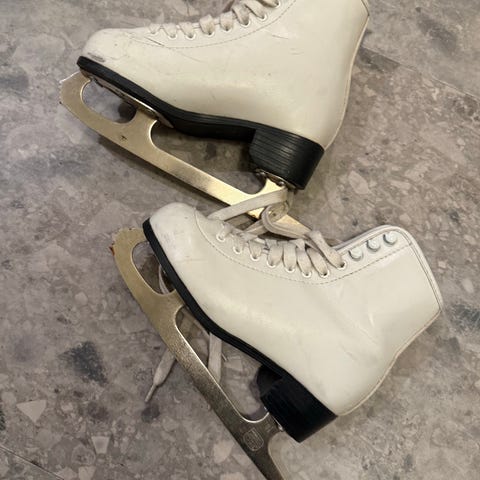 Hvite kunstløpskøyter for barn. Klassisk modell med høyt skaft og snøring foran for god støtte rundt ankel. Skøytene har sort hælparti og metallskinne med tagger foran. Egner seg til bruk på isbaner og skøytebaner for lek og enkel kunstløpstrening. Innleggssålen på bildet viser omtrentlig lengde på foten som passer i skøytene. Måler 23,5 cm.