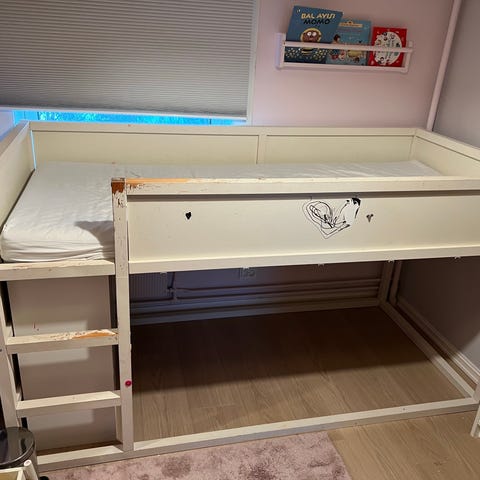 Trenger litt maling og generell tlc. Følger med madrass. Størrelse 90x200