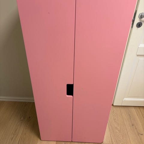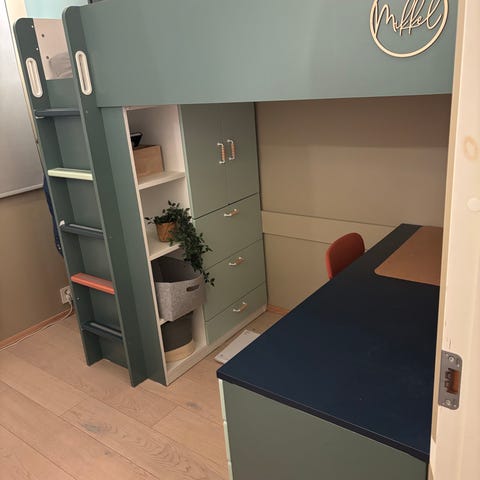 IKEA loftseng for barn med integrert skrivepult og garderobeskap. Sengen er utført i hvit overflate med kontrastfelt i mørk farge på skuffer og skapdør. Under sengen er det arbeidsplass med skrivebord og skuffeseksjon, samt åpen hylle. Trapp med trinn i siden gir tilgang til soveplassen oppe. Ved siden av trappen er det garderobeskap med dør og oppbevaringsplass. Egnet for barnerom der man ønsker å kombinere seng, oppbevaring og arbeidsplass i én møbelkombinasjon.