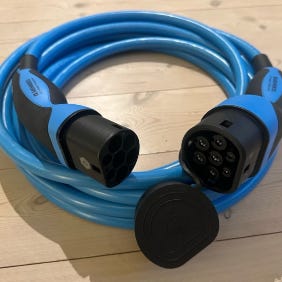 Mennekes tekniske spesifikasjoner på kontakthodet. Maks strømstyrke er 32 A / 480 V, 3-faset. 7,5 meter