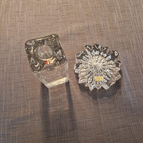 Den er håndlaget i krystall og gir et fantastisk spill i lyset når et telys brenner i holderen bak.