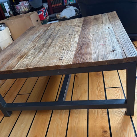 Bordet er i stål og tre, solid og stabilt. Må hentes hos meg.