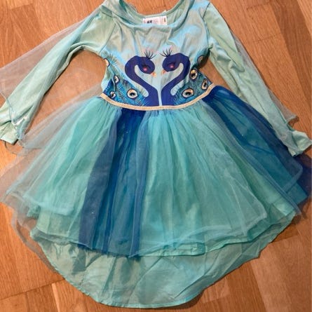 H&M kjole for barn i størrelse 104 for jente. Kjolen er blå og laget i polyester. Overdelen har lange ermer og motiv av to påfugler foran. Skjørtet består av flere lag tyll i ulike blåtoner. Bak har kjolen et lag gjennomsiktig stoff som gir kappeeffekt. Passer som utkledningskjole eller festkjole til barn som bruker størrelse 104.