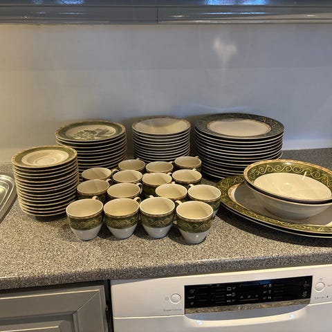 Rörstrand servise bestående av tallerkener og ildfaste former i porselen. Delene har dekor med motiv i midten og rød kant rundt. Tallerkenene egner seg til servering av middag eller dessert, mens de ildfaste formene kan brukes til ovnsretter og servering direkte på bordet. Serviset passer til bruk i kjøkken og spisestue ved både hverdags- og sesongmåltider. 6 personer