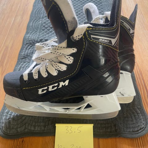 CCM ishockeyskøyter for barn i størrelse 35. Skøytene er i hovedsak svarte med lyse detaljer og hvite lisser. De har fast hælkappe og ankelstøtte som gir stabilitet på isen. Underdelen har hvit holder og stålskinne tilpasset ishockeybruk. Egnet til bruk på isbaner og ishaller for trening og lek på isen.