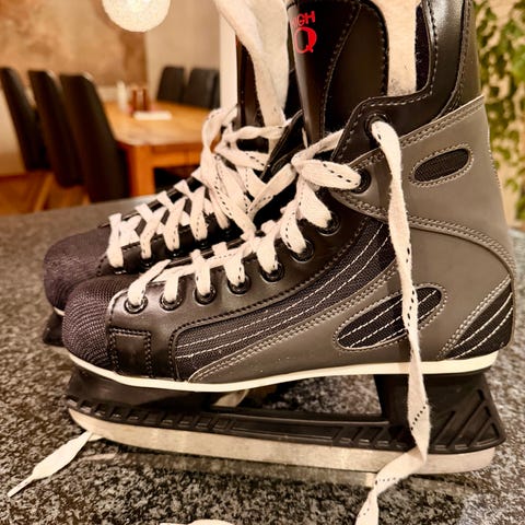 High Q ishockeyskøyter i størrelse 40. Skøytene er i svart og hvit farge med snøring foran og polstret pløse for støtte rundt ankel og vrist. Egner seg til ishockey og annen bruk på is, for eksempel trening eller fritidsbruk på isbaner og skøytebaner.