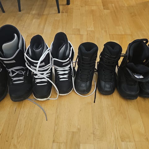 Snowboardstøvler med knyting. Disse er godt brukt, men fungerer fortsatt greit. Iallefall som nybegynnersko. Er en liten "sprekk" på ene skoen, men har ikke hatt betydning for bruken. Aldri blitt kald eller vår igjennom.