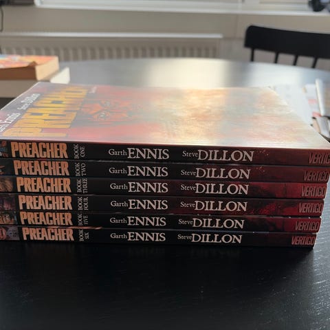 Preacher Book One tegneseriebok. Heftet utgave med illustrert forside. Inneholder tegneseriehistorier i Preacher-serien, egnet for lesere av grafiske romaner og tegneserier.