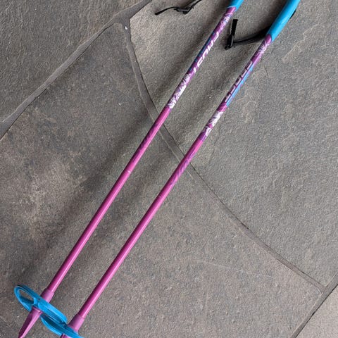 Skistaver i blå og hvit farge. Stavene har håndstropper øverst og store trinser nederst som gir støtte på snø. Egnet til bruk på ski, for eksempel til barn eller mindre voksne, avhengig av lengde på stavene.