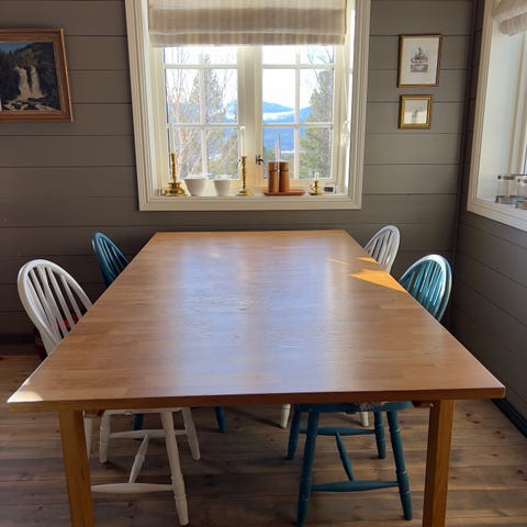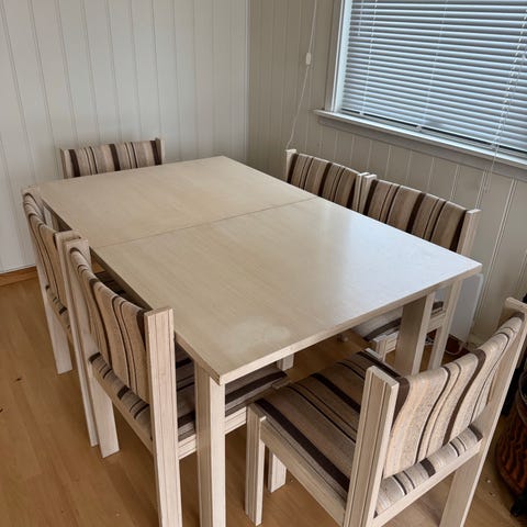 Spisebord i heltre oljet eik selges 2000,-. 220cm langt+to ileggsplater på 50 cm hver. 100 cm bredde. God plass til 12 når disse står i. Solid bord uten store bruksmerker. Ileggsplatene er noe treige å få på plass.