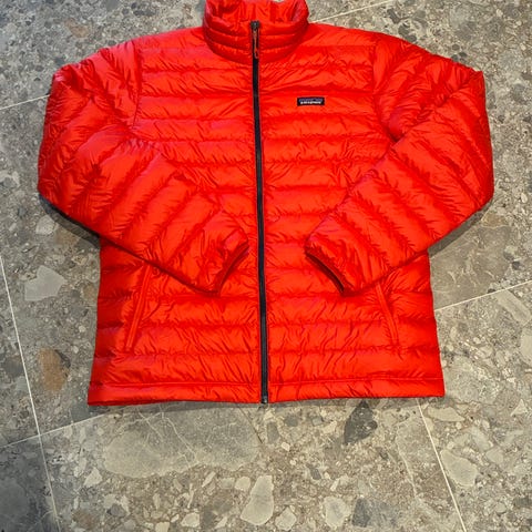 Patagonia dunjakke for herre i størrelse L. Jakken er blå og fylt med dun, med vatterte kanaler som gir jevn isolasjon. Modellen har glidelås i front og høy krage. Egnet som ytterjakke eller mellomlag til hverdagsbruk og utendørsaktiviteter i kjølige temperaturer.