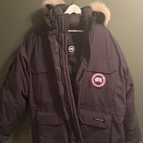 Canada Goose vinterjakke i herremodell, størrelse M. Jakken er svart og fylt med dun. Den har hette, frontlukking med glidelås og klaff, samt flere utvendige lommer med klaff. Canada Goose-logo er plassert på brystet. Egnet som varm ytterjakke i kaldt vintervær.