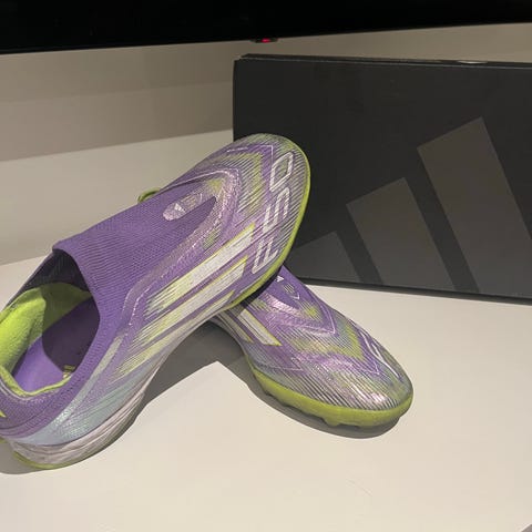 Adidas F50 fotballsko i lilla med gule detaljer. Modellen har overdel uten lisser og FG-knotter til bruk på naturgress. Skoene leveres sammen med tilhørende lilla skopose med F50-logo. Passer til fotballspillere som ønsker lette sko med tettsittende passform. Passer ikke til mine bein. Str 45 og 1/3