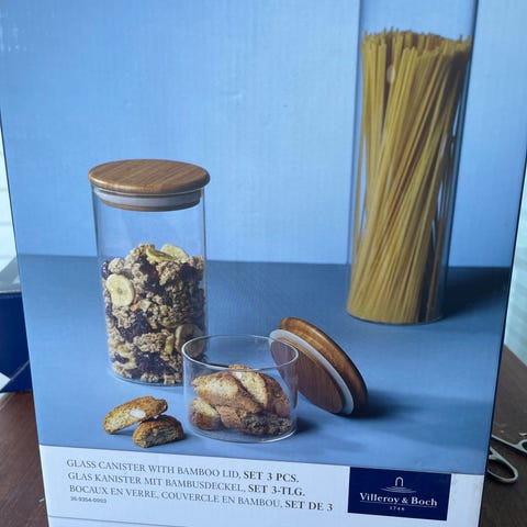oljekarafler i klart glass med blå lokk. Settet består av to karafler plassert på et brett i tre. Egnet til servering og oppbevaring av for eksempel olje, eddik eller andre flytende krydder på kjøkkenet eller ved borddekking.